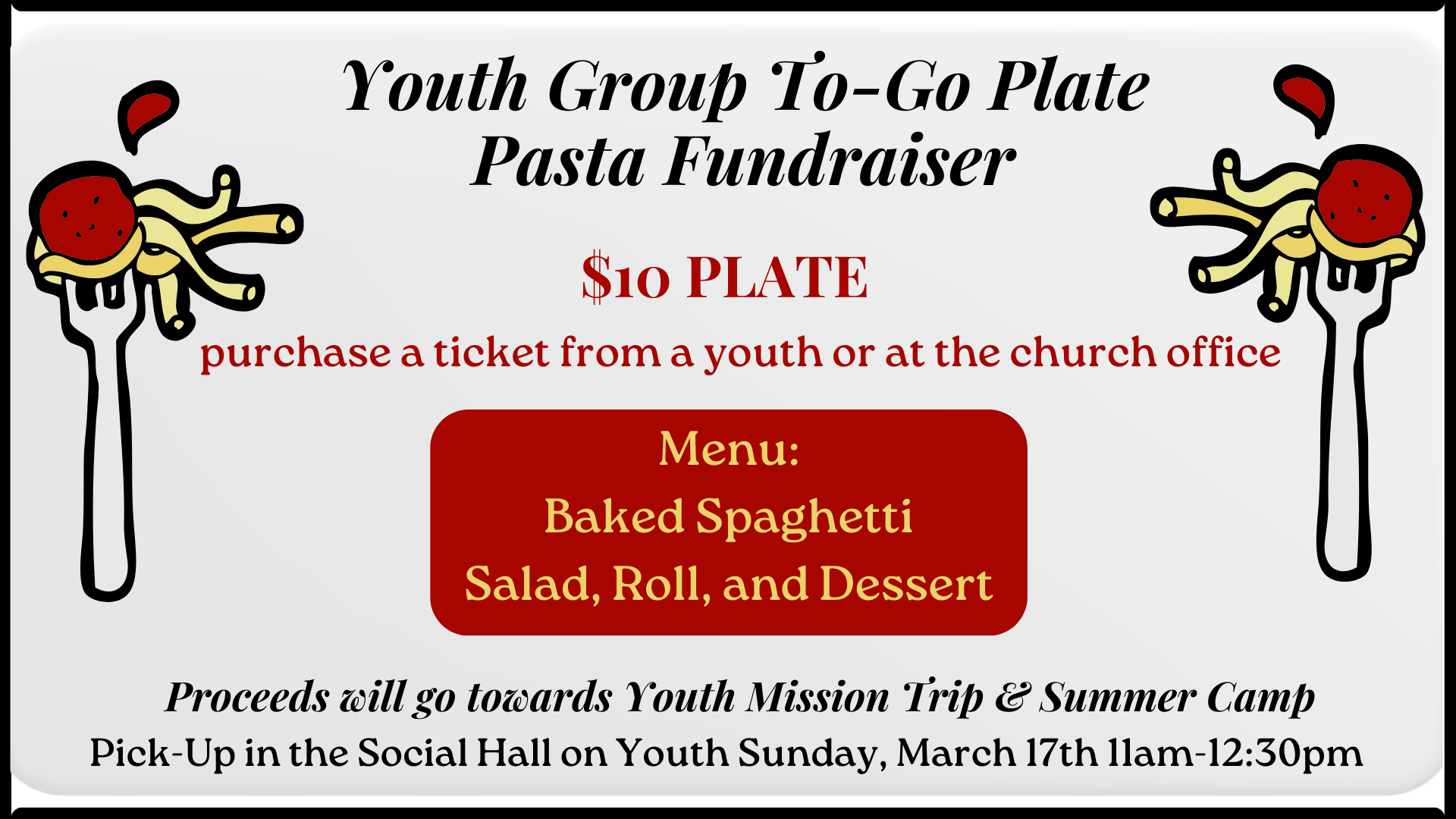 The to-go plates will include baked spaghetti, salad, bread and a dessert. The cost for each plate is $10. The funds will be used to offset costs associated with the Summer Youth Camp.